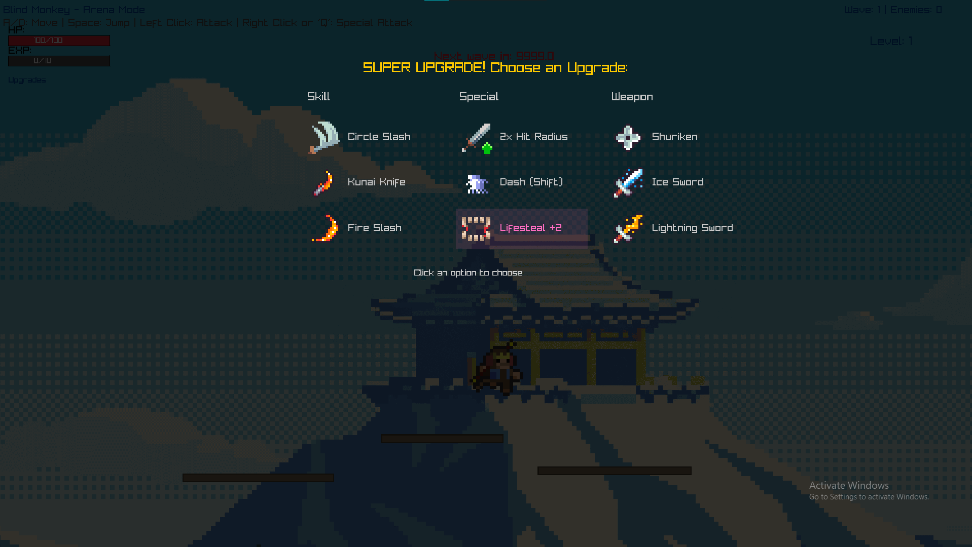 Blind Monkey is a 2d Roguelike where you control a small hero fighting endless waves against evil ninja. After an enemy is defeated they drop an experience orb that empowers the monkey, and after enough waves the player will receive a super upgrade for even more power. See how long you can last before the enemy ninja take your home. The controls use the mouse where holding down left mouse button and swiping fast deals more damage and equipment gained through super upgrades can be used with “q” or right click , movement includes a dash used with left shift that comes from a super upgrade, the basic movement includes a double jump with ‘w’ or space, ‘a’ to go left and ‘d’ to go right.